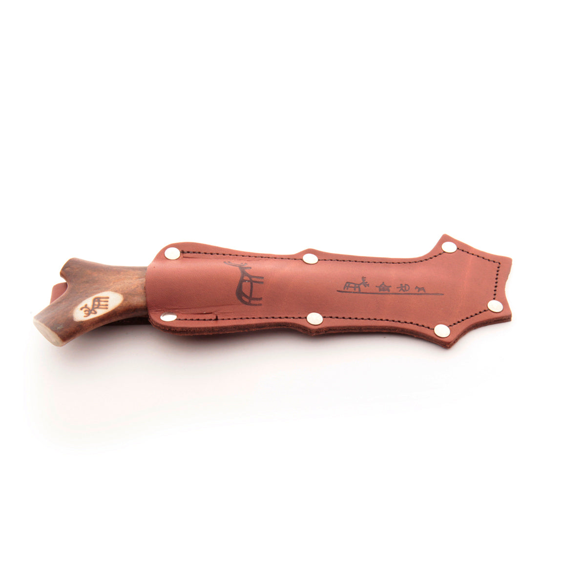 This is the "big brother" to the Reindeer 60, with a larger blade, more substantial handle, and rivets to reinforce the stitching on the sheath. The sheath is stamped with a hunting scene and the handle is carved with hunting figures. There will be variation between the item picture and the exact shape and engravings on the handle. This makes every piece a little unique. NOTE: the item pictured has engraving along the blade, but the knives that we have in-hand do not have this engraving.