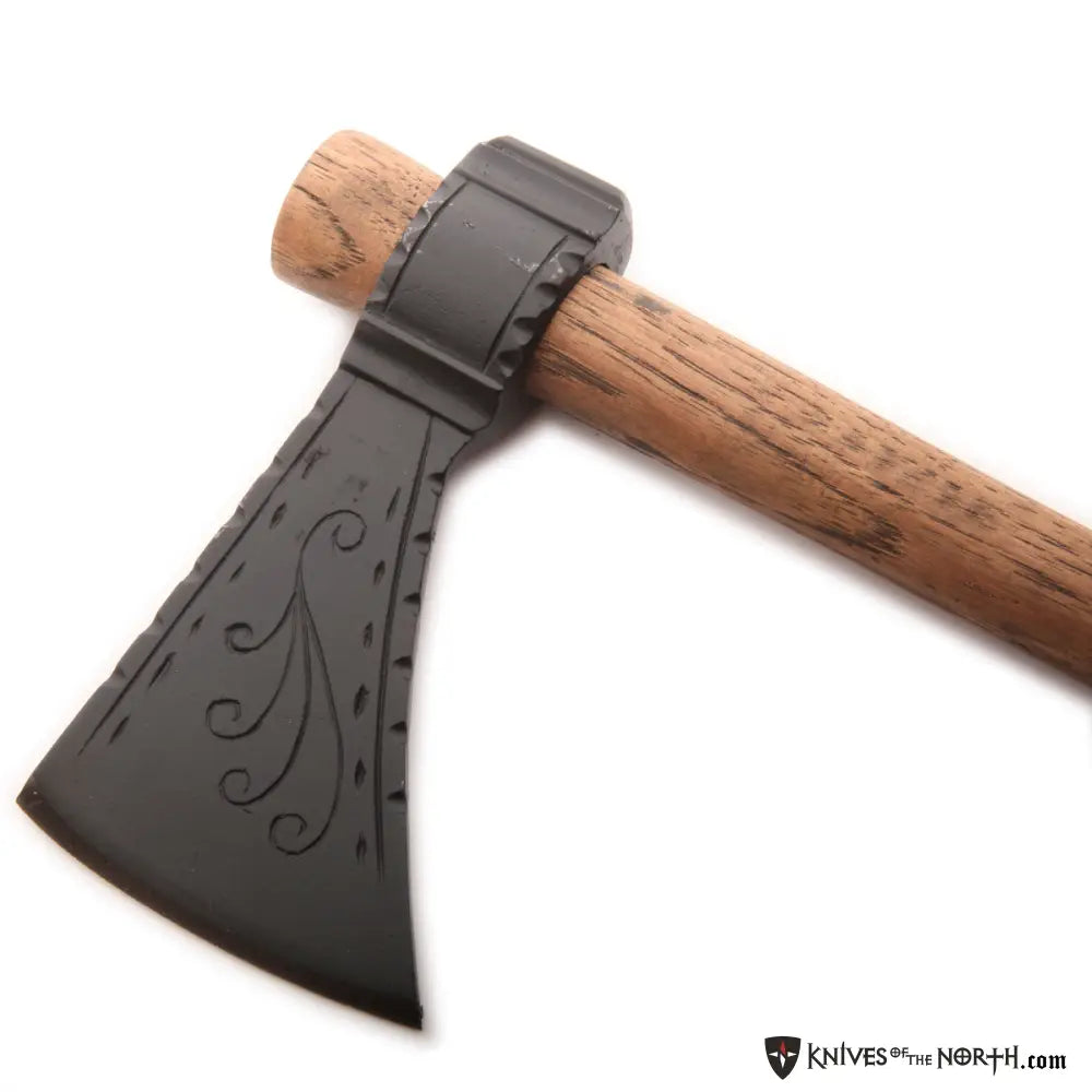 The Iroquois axe is a more attractive model, with decorative scrollwork along the head. Made from tough 410 stainless steel with a HRC of 38-45. If you're using this axe for throwing, you should pick up some spare handles. The replacement handle for this axe is the oval style. Axe comes sharpened.