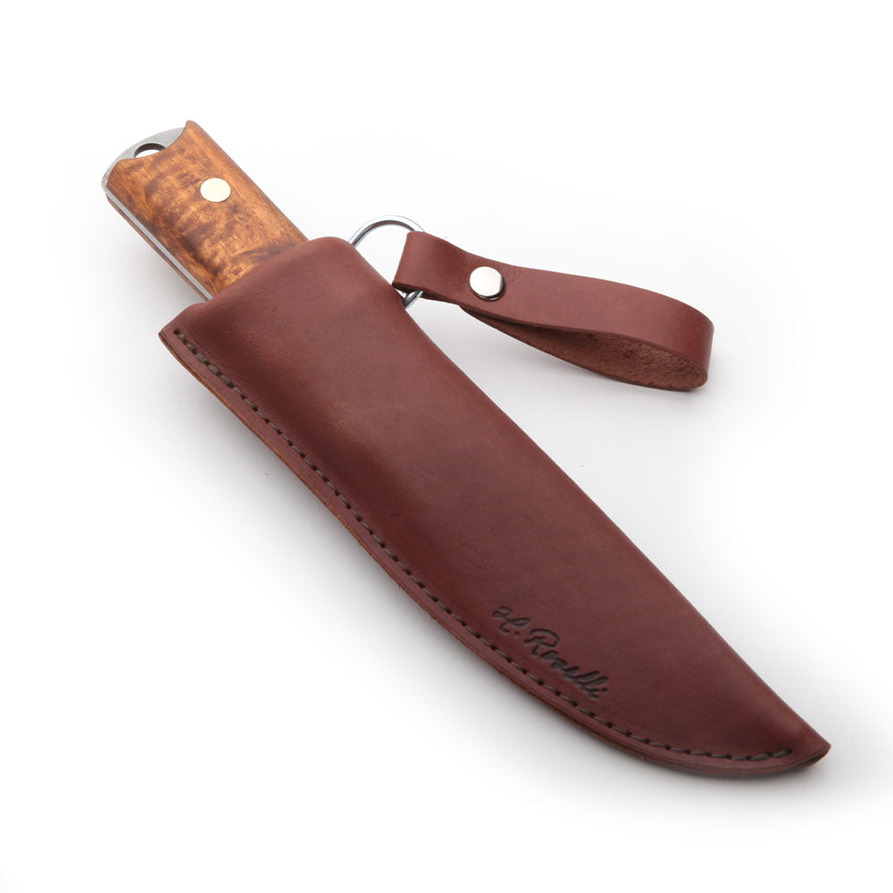 The knife has a stained curly birch handle with brass staples and lanyard hole, which is coated with linseed oil – to ensure a firm grip, even when wet. It comes with innovative handcrafted sheath of dark vegetable tanned Finnish leather, with a metal spring which keeps your knife secured.