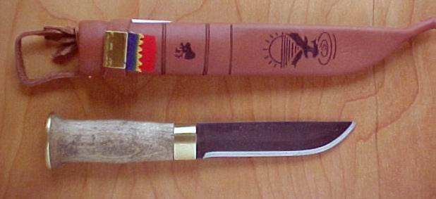 The Old Fashioned 5" Strömeng leuku has a blackened carbon steel blade and the handle is stained with the traditional tar finish.
