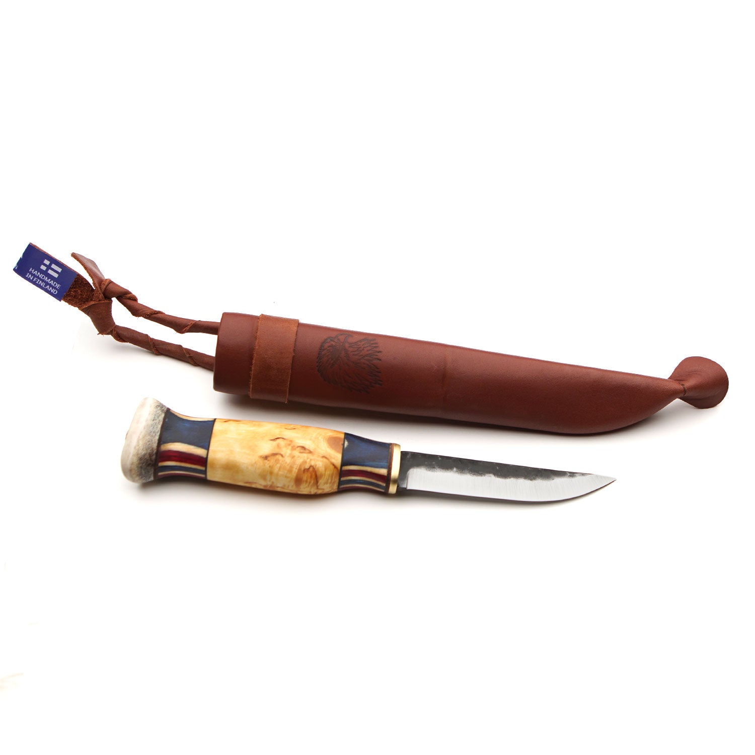 Wood Jewel has made a knife with a handled colored in red, white, & blue. The handle is a very attractive assembly made by pressing together many thin layers of stained wood, and then sculpting and shaping the handle so that as the different layers are exposed, they form gorgeous surface patterns. This is is a solid all-around camp or utility knife, featuring a shorter, stout carbon steel blade, with additional handle accents from reindeer antler. The blade has visible hammer marks for a "hand forged" look, adding still more attractive quality to an already eye-catching piece. The full-length tang is evident by the brass nut on the pommel, giving this knife added durability.