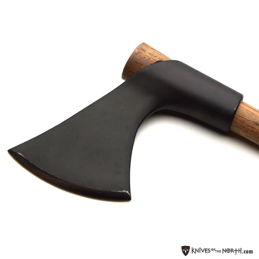 This style of axe, also called a Francesca, can be traced back to numerous locations in early-period Great Britain and France. The upswept profile alters the balance and makes this axe rotate more quickly when thrown, making this a favorite in competitions because it allows the thrower to stand closer to the target. With most other throwing axes, the thrower gets a full rotation from between 15 and 17 feet, but this axe will give a full rotation from 11-12 feet. You can also hold it backwards (with the edge facing towards you), stand at the 10-foot line and lean way over, and stick it in the target with a half-rotation. Made from tough 410 stainless steel with a HRC of 38-45.