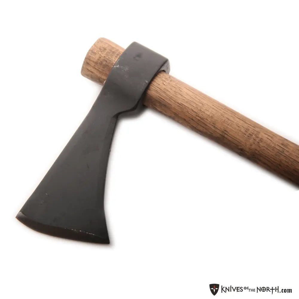 This is the lightest style of axe that we carry (aside from the mousehawk), weighing in at just over one pound with the handle. The straight flat top of the axe head creates a nice sharp 90 degree angle where it meets the edge, which makes this axe easy to consistently stick in even harder targets, if you over-rotate it slightly. The head is also exceptionally narrow, which also contributes to the ease of sticking it into a target as the angle of the edge isn't as aggressive as some of the other axe styles. Made from tough 410 stainless steel with a HRC of 38-45.