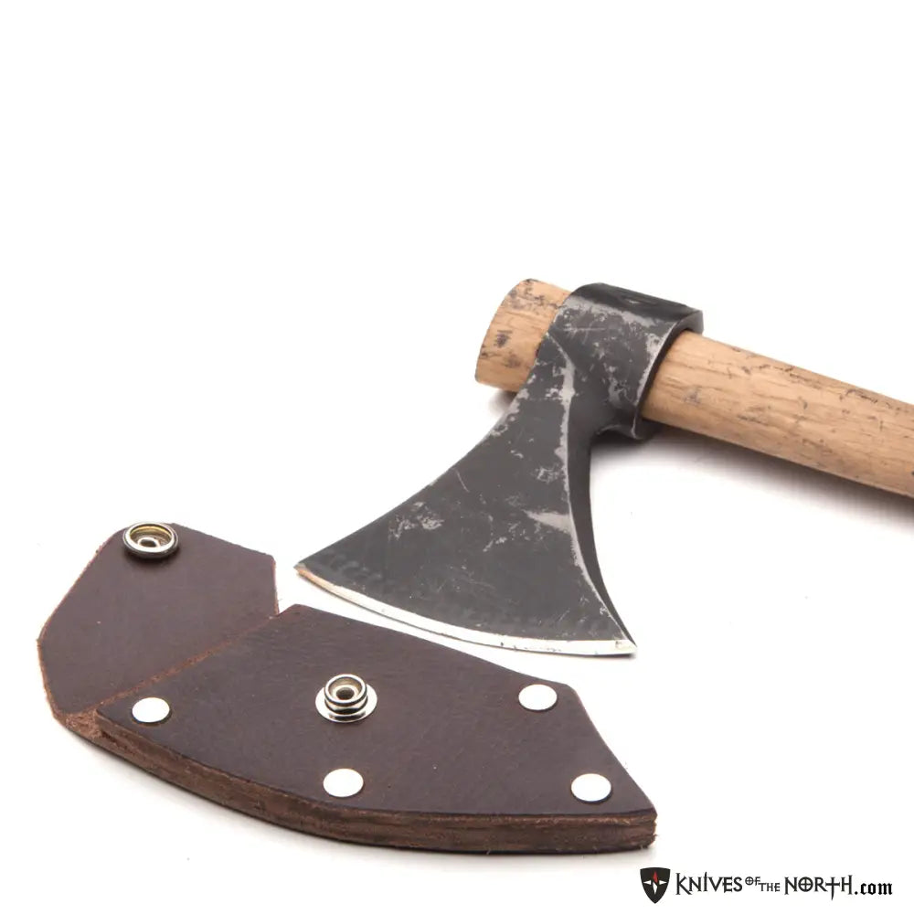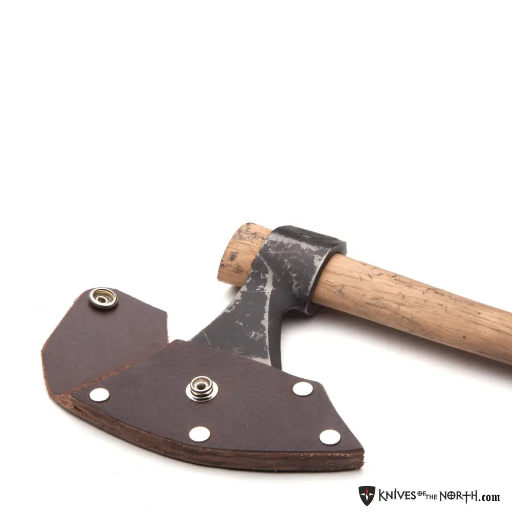 Our friend Wilhelm at Lost Helm Industries came up with these great covers for our throwing axes. Made from high-grade leather with strong rivets and snap closures, these make your axe "grab safe" by completely covering the edge and sharp points. The leather is suitable for carving, stamping, or painting.