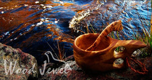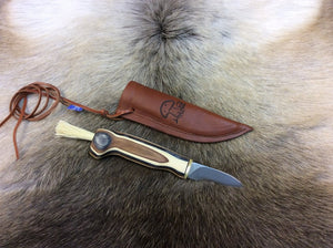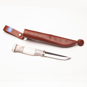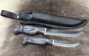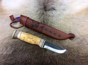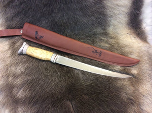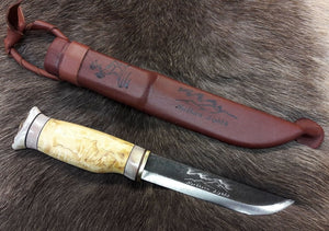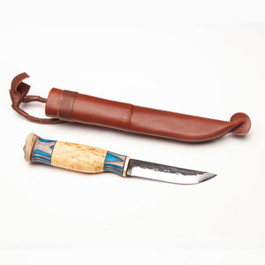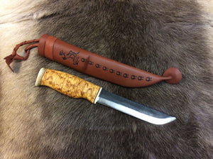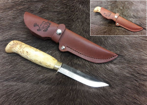 Wood Jewel knives are made in the far north of Finland, north of the arctic circle, in the small town of Kolari, Finland. Kauko Raatiniemi designs the knives to be beautiful as well as highly functional, using the traditional materials of curly birch wood and reindeer antler. Each knife is a work of art. The sheaths also closely follow Scandinavian tradition, with a deep-pouch design and a twisted leather thong which lets the sheath swing freely and not get in the way. The sheathes also contain a small plastic insert to prevent these very sharp blades from slicing through the sheath and into your hand.