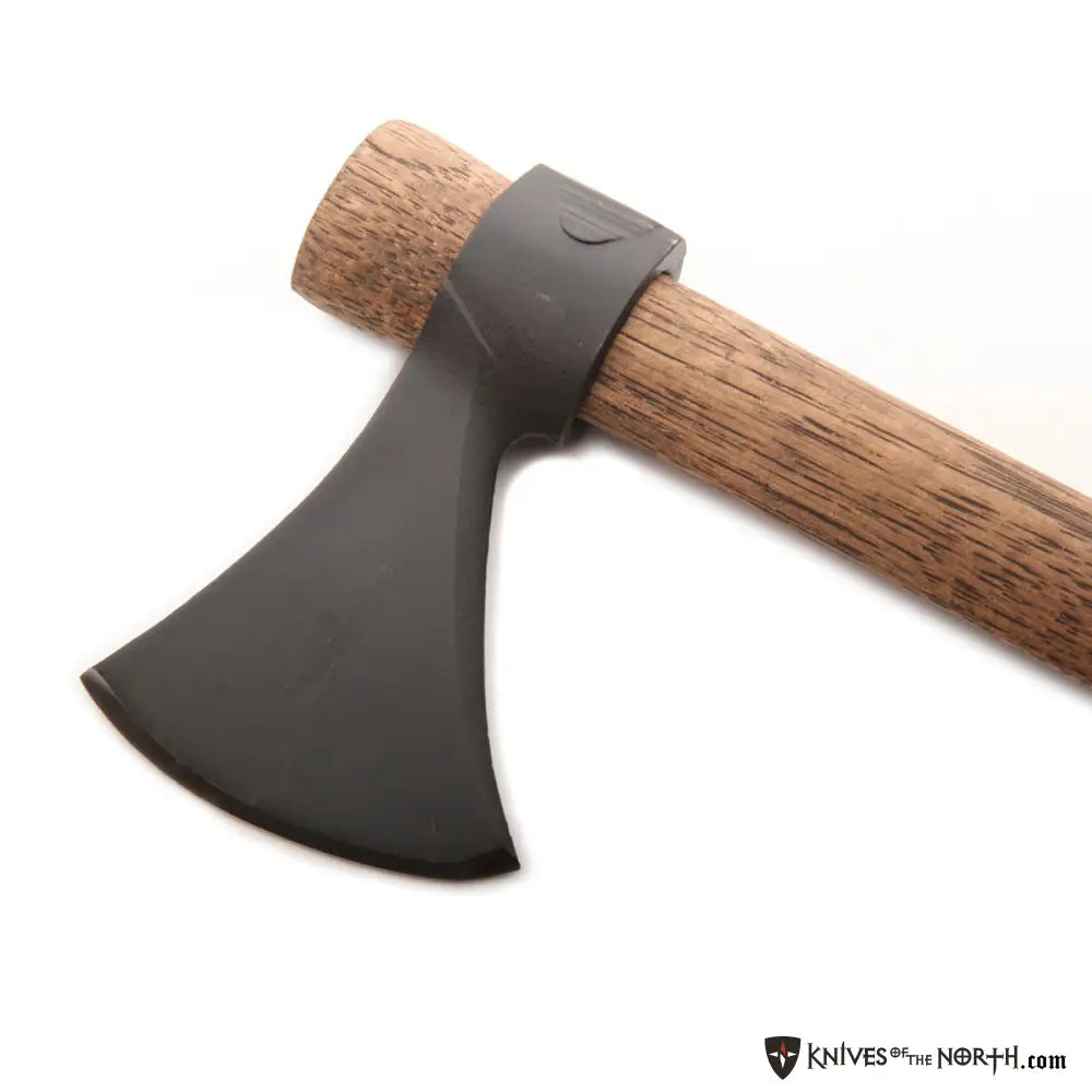 This is a great reproduction of late-period Native American tomahawks, with a curved edge profile. Made from tough 410 stainless steel with a HRC of 38-45. If you're using this axe for throwing, you should pick up some spare handles. The replacement handle for this axe is the tear-drop style. Axe comes sharpened.