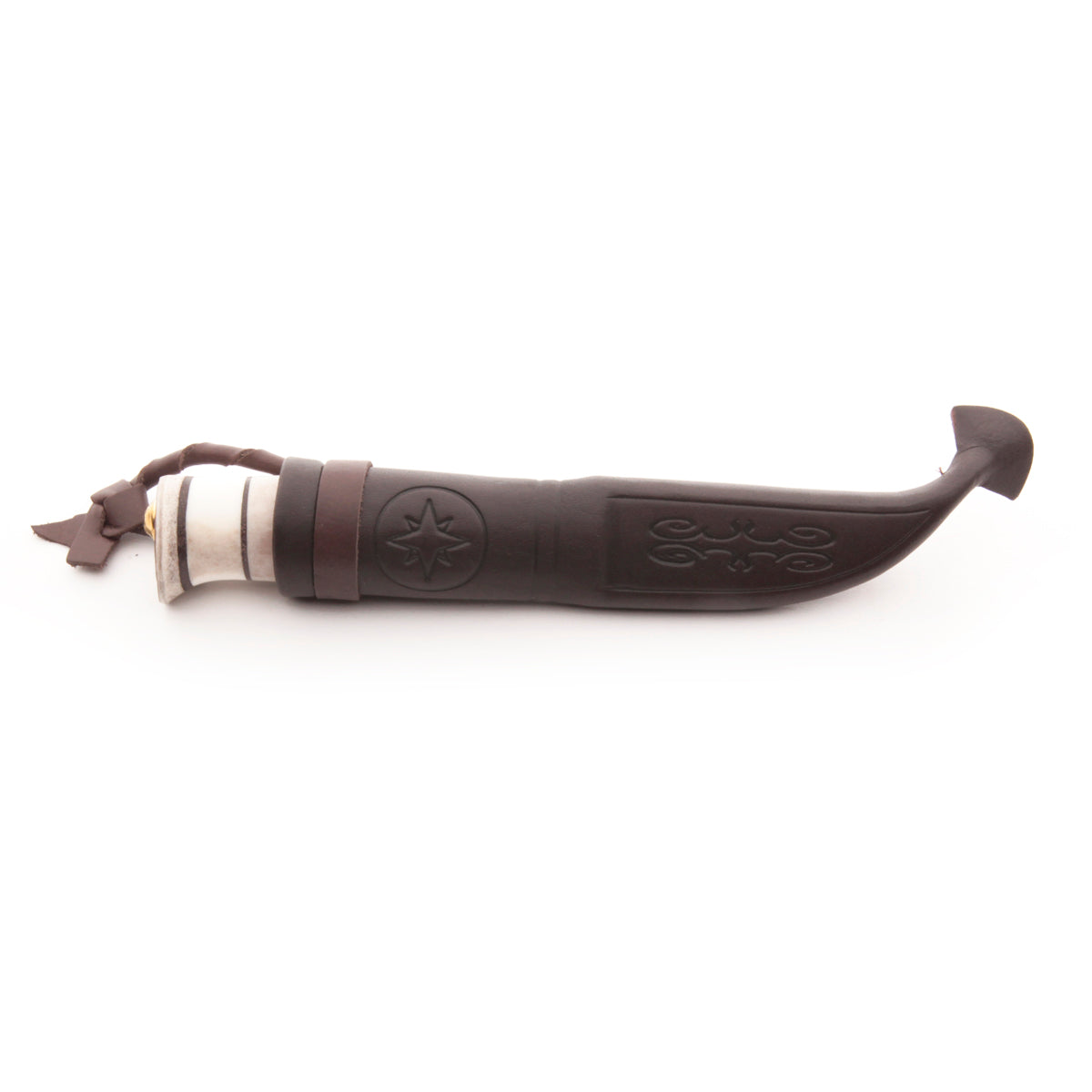 This is an absolutely gorgeous knife with a handle that is made almost entirely from reindeer antler, in different shades and separated by fibre spacers. Most Scandi knives have a wooden handle with antler highlights, but this handle really makes this knife stand out from the crowd. The handle is very well crafted and is sculpted into a comfortable, ergonomic shape. The traditional deep-pouch sheath features stamped designs and a plastic insert.
