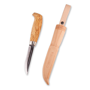 This is a traditional Scandinavian design for a puukko, with a curly birch handle and leather sheath. It's a classic, it's basic, and it's very much a product of the northern European envrionment. This is a solid all-around camp or utility knife, featuring a medium-length, slender stainless steel blade. The handle is made from curly birch wood, sanded and polished to a smooth finish, and has a hooked pommel to prevent the knife from slipping out of your hand. The full-length tang is evident by the brass nut on the pommel, giving this knife added durability. The blade is lightly inscribed with the Iisakki Järvenpää signature.