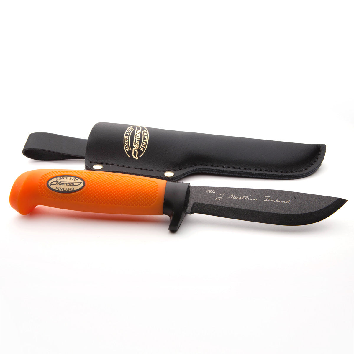 This is Marttiini's trademark stainless steel skinning blade, with a mild drop-point profile and ample belly designed for skinning, bearing the Marttiini signature etched into it. The blade is coated with Martef, which is a titanium-based slippery non-stick coating similar to Teflon, which reduces drag and friction and makes slicing much easier. The handle is made from textured rubberized plastic and offers a very solid grip even when wet, and it has both a guard and a hooked pommel so the knife will never slip out of your hand.
