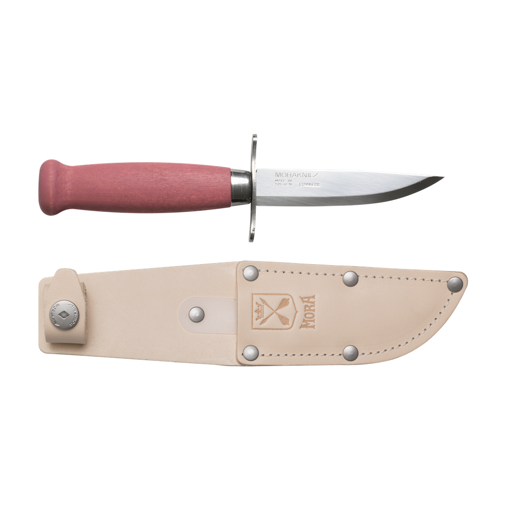 The "Scout" is intended for younger scouts. It features a prominent guard combined with a flared pommel to help smaller hands keep a firm grip. The handle circumference is also sized to accommodate smaller hands. It's up to you to decide if your child is experienced enough for a knife like this though, as the blade is still very, very sharp. The flat-style sheath has a loop and snap fastener to keep it in place.