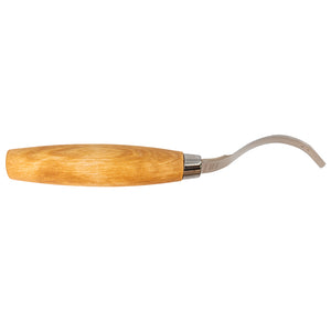 This is an excellent quality wood carving "hook knife," for use in carving spoons, bowls, or any type of concave detailing.  The curve is more gentle, for carving more shallow impressions.  The stainless steel blade is sharp on both sides, so it can be used in either hand.  The large, round handle provides a solid gripping surface.  The tang is visible at the pommel, meaning you can apply a lot of force and this knife will hold together.  It does not come with a sheath.