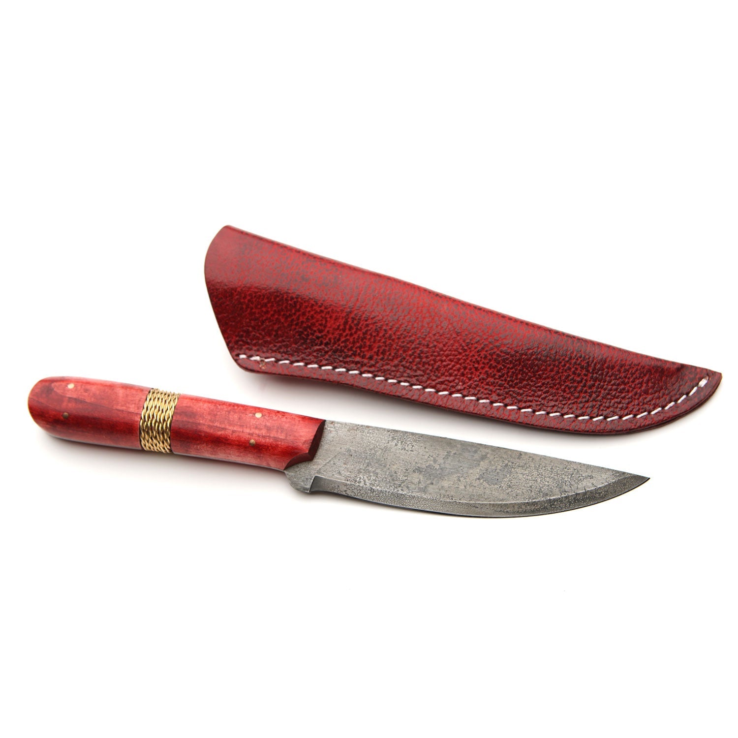 The Hudson's Bay Roach is the largest and heaviest of the Trade knives. It has a heavier, thicker blade well-suited for heavier camp and wilderness tasks such as chopping and shelter building, and would also do well as a butcher knife for larger game. The ample belly on the blade (hence the name) also makes it ideal for skinning larger game. This version is stained red with brass wire wrapping, and comes with a beautiful red pebbled leather sheath.