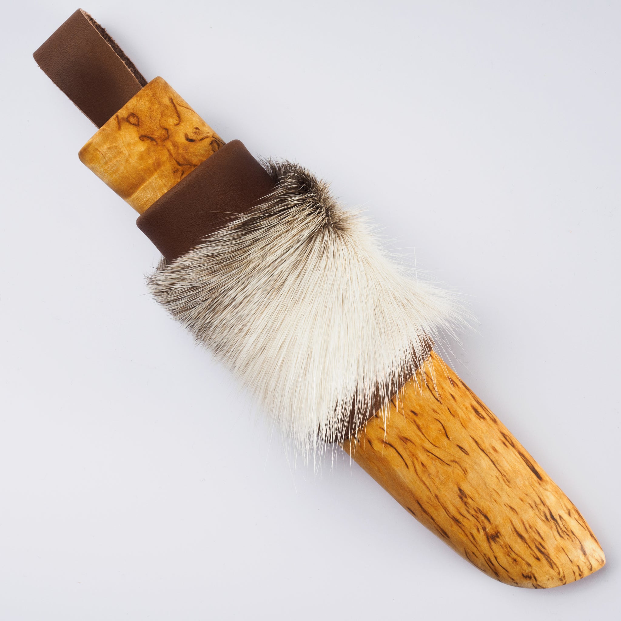 Comes with handcrafted sheath of dark vegetable tanned Finnish leather in combination with curly birch and details of reindeer fur – which makes it a perfect gift for anyone. This knife is a work of art!