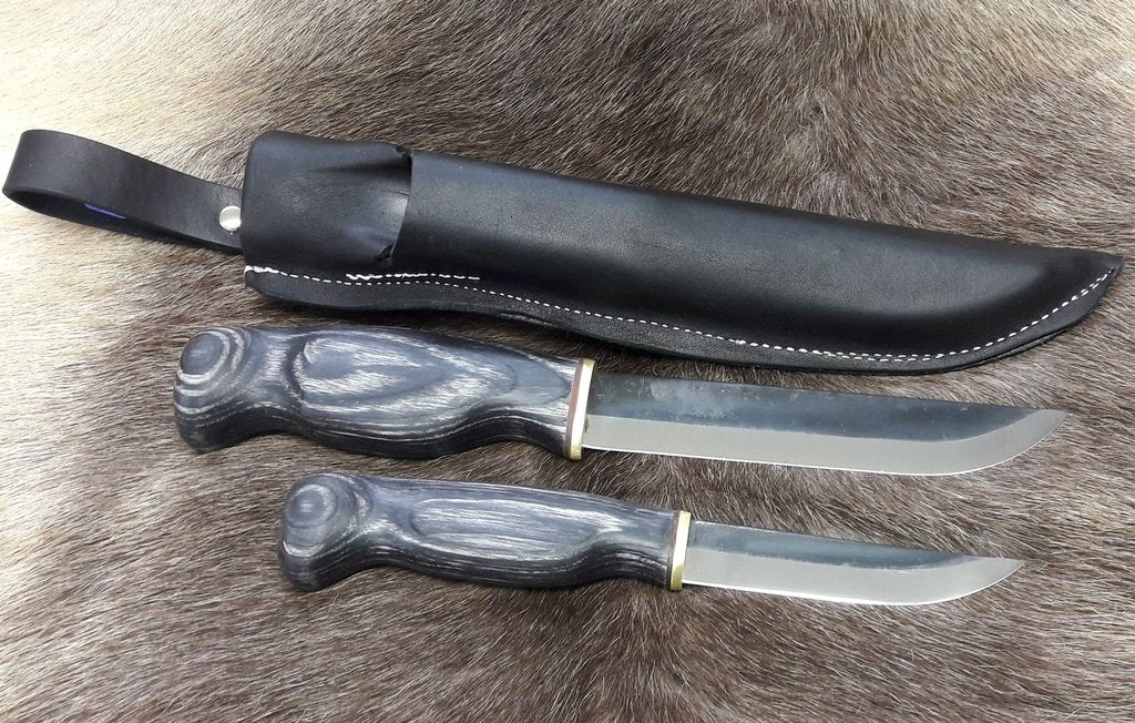 Click here for more details on Wood Jewel knives, and links to some video reviews!This is a wonderfully useful combination of the puukko knife, used for smaller camp chores and carving, and the leuku, used for larger chores like butchering and chopping wood, both in the same sheath. The handles are very attractive assemblies made by pressing together many thin layers of stained wood, and then sculpting and shaping the handle so that as the different layers are exposed, they form gorgeous surface patterns. The handles have both an inset for your index finger, and hooked pommels so the knives will never slip out of your hand. The full-length tangs are evident by the brass nuts on the pommels, giving these knives added durability.