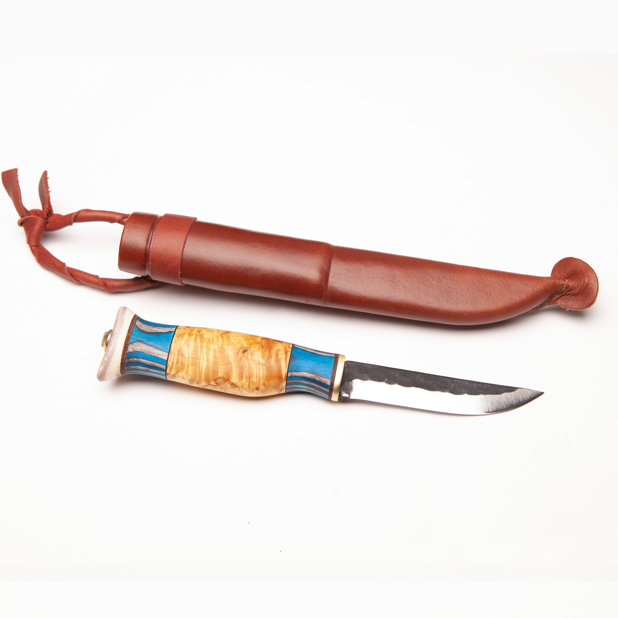 The handle is a very attractive assembly made by pressing together many thin layers of stained wood, and then sculpting and shaping the handle so that as the different layers are exposed, they form gorgeous surface patterns. Each knife will be slightly different in the patterns from the handle shaping process. This is is a solid all-around camp or utility knife, featuring a shorter, stout carbon steel blade, with additional handle accents from curly birch wood. The shorter blade has visible hammer marks for a "hand forged" look, adding still more attractive quality to an already eye-catching piece. The full-length tang is evident by the brass nut on the pommel, giving this knife added durability.