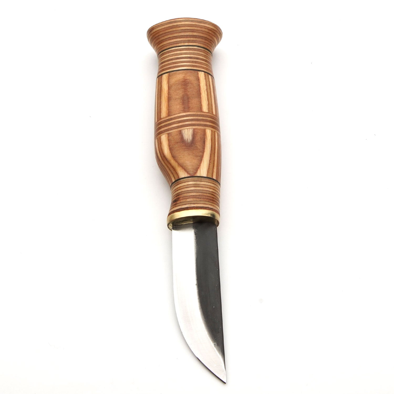 This is a stunning knife made from multiple layers of wood stained in different colors and then pressed together in a crosswise pattern. It is a great example of simple materials making a very complex and attractive product.